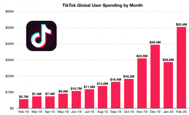 TikTok и его клон из Китая Douyin за апрель этого года заработали $78 миллионов на покупках внутри приложения, обогнав YouTube, Netflix и Tinder. Важно отметить, что данные не учитывают доходы от рекламы и игр. Ближайший преследователь (YouTube) за этот же период заработал $76 миллионов.