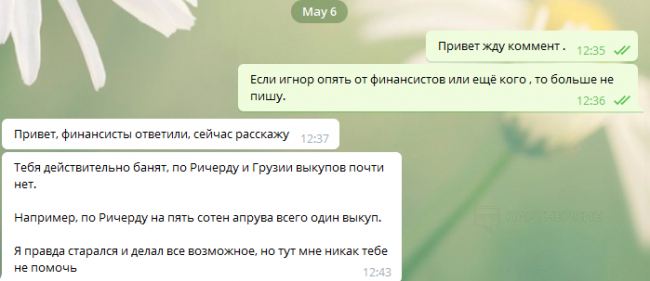 Насколько позволят выложить такое здесь не очень ясно. Так как прекрасный основатель Максим прекрасно ладит со всеми. )) и с Партнеркином тоже. Но для меня теперь любые касания его компании совсем другое отношение, да и настороженное отношение к российским партнеркам увеличилось на 200%. Текущий случай дал хороший повод переключиться на другие рынки и партнеров.