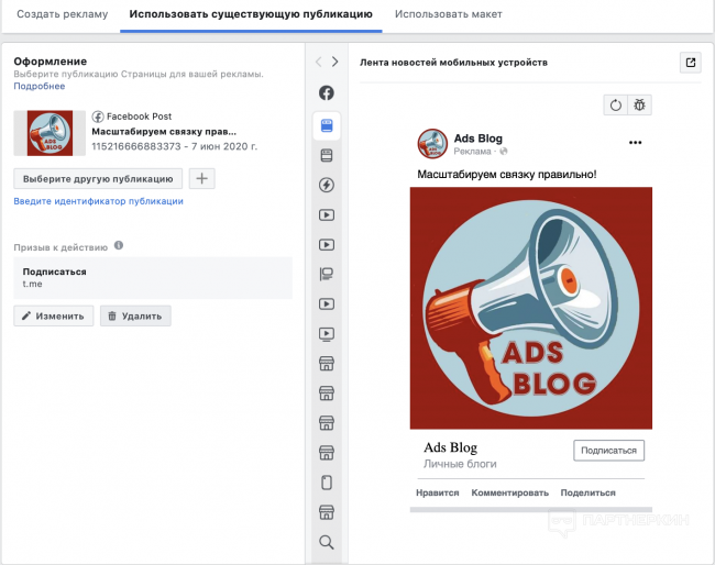 3. С этого же соц.аккаунта заходим в AdsManager и доходим до пункта создания объявления. Жмём на "Использовать существующую публикацию".