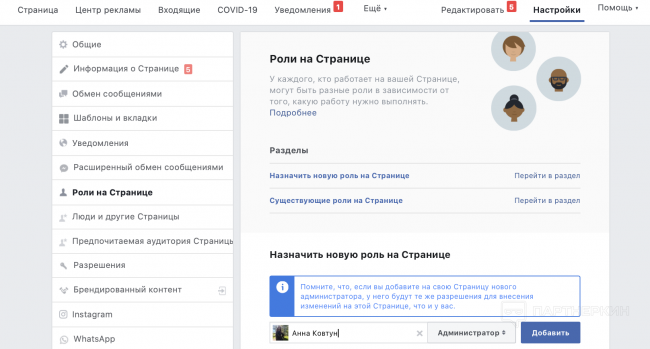 5. Заходим в настройки Fun Page и расшариваем доступ администратора на соц.аккаунт, с которого планируем запускать рекламу.