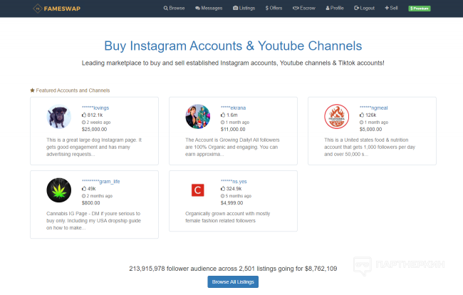 Fameswap — один из старейших маркетплейсов для покупки-продажи TikTok- и Instagram-аккаунтов, а также YouTube-каналов. Платформа имеет огромную базу покупателей в более чем 50 странах. Ежедневно крупные бренды, блогеры и маркетинговые агентства используют Fameswap для поиска своего «идеального претендента».