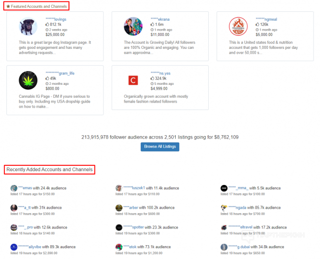 Следующая вкладка — «Listings». Здесь продавцы добавляют свои аккаунты/каналы на платформу.