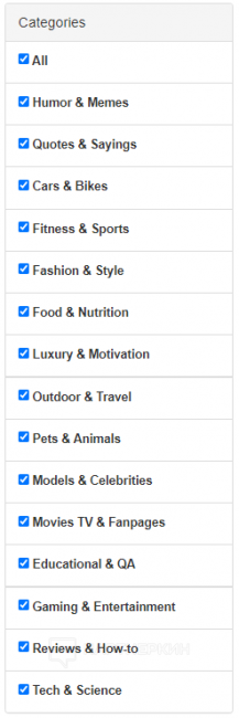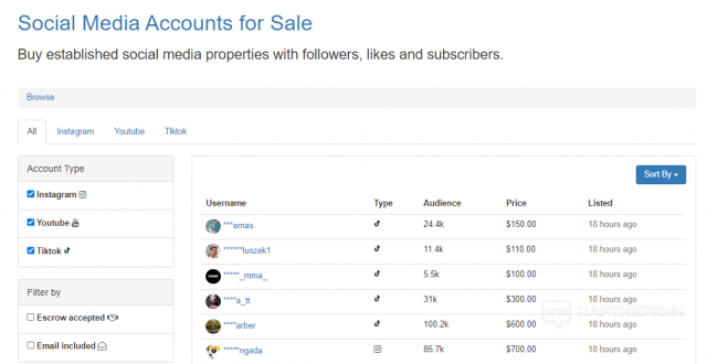 Для удобства пользователи могут сортировать аккаунты по количеству подписчиков, дате размещения и стоимости, а также просматривать аккаунты конкретной соцсети. Для тех, кто ищет аккаунты определенных тематик, есть удобный фильтр по категориям: