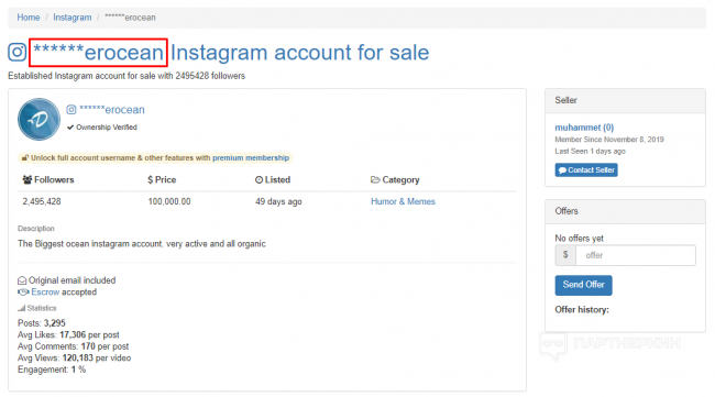 Первое, что мы видим, — частично скрытое имя аккаунта (полное имя доступно при покупке Premium-аккаунта, но об этом позже). Второе — вся информация по аккаунту: когда размещен на платформе, к какой категории относится, сколько стоит, количество подписчиков, описание и статус владельца (верифицирован). Третье — статистика, которая берется непосредственно из учетной записи: количество постов, среднее число лайков и комментариев на постах, вовлеченность и т.д.