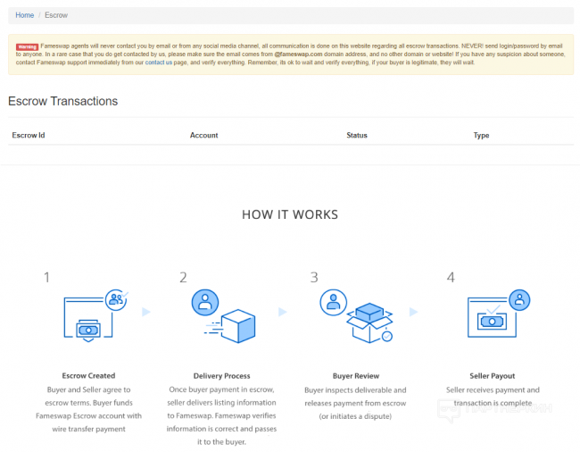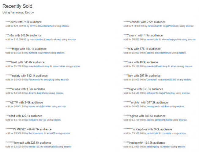 Fameswap Escrow — услуга, при помощи которой продавцы и покупатели смогут безопасно совершать сделки и получать своё: продавцы — деньги, покупатели — аккаунты в соцсетях. Комиссия Fameswap Escrow составляет 5% от предложения или $50 минимум (в зависимости от того, что больше) и доступна для сделок на сумму более $100. Кто будет платить комиссионные (продавец, покупатель, поделят на двоих) — определяется в момент создания эскроу. Список всех последних транзакций доступен по ссылке: