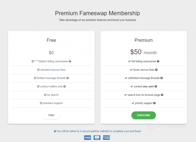 Для премиум-аккаунтов Fameswap доступна скидка 50% на услугу (при условии, что пользователь активен в течение последних двух месяцев). Пример с продавцом: если ваши комиссионные составили $50, сервис добавит к вашей окончательной выплате $25. Пример с покупателем: если ваши комиссионные составили $50, сервис вернет $25 после совершения сделки. Подробнее об услуге можно почитать тут.