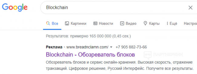 Для примера возьмем популярный кошелек blockchain.com. Вводим в Google название и видим, что на первом месте появляется какой-то сомнительный ресурс: