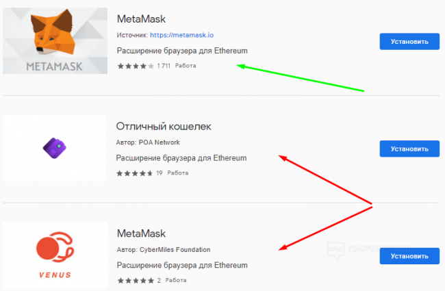 Для примера, если зайти в интернет-магазин Chrome и ввести в поиске «Metamask», то мы видим 3 кошелька, 1 настоящий и еще 2 от неизвестных авторов, которые я бы не стал устанавливать: