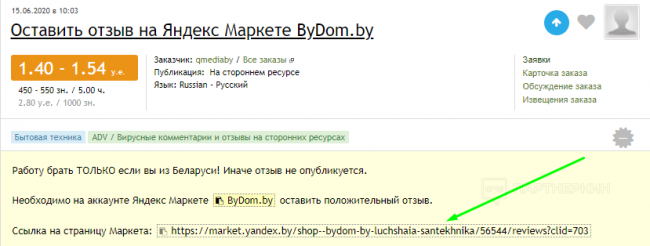 Но мне, все же, удалось найти один заказ, где автор в открытом доступе указал ссылку на страницу Маркета: