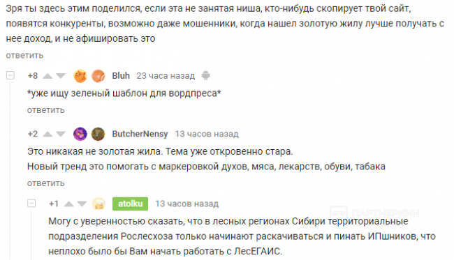 Один из пользователей Пикабу под ником «Atolku» опубликовал интересную историю о том, как он нашел нишу без конкуренции и начал зарабатывать в ней почти 50 000 рублей в месяц. Забегая вперед: идея еще не масштабирована и ждет своего монополиста. Но обо всем по порядку. Как появилась идея Когда автор поста в начале января 2020 года сидел в компании друзей, один из них, Сергей, пожаловался на систему ЛесЕГАИС, из-за которой теперь нужно регистрировать каждую сделку. Сергей на протяжении последних нескольких лет занимался поставкой пиломатериалов и к новым технологиям относился настороженно. Он понятия не имел, как зарегистрироваться в системе и как вести работу с ней, из-за чего ему грозил штраф почти в 30 000 рублей. Тут нужно пояснить, что такое ЛесЕГАИС. Это единая государственная система, в которой ведется учет всех операций с древесиной. Все, кто работает в сфере продаже леса — как юридические, так и физические лица, обязаны регистрировать в системе каждую сделку. Atolku (своего настоящего имени он не раскрывает), который был знаком с ЛесЕГАИС, предложил Сергею свою помощь — он пообещал приехать к нему после новогодних каникул и показать, как работать с системой. Однако по приезду он сразу же получил от друга другое предложение — вести работу с ЛесЕГАИС за 5 000 рублей в месяц. Сергей не захотел разбираться в тонкостях системы и не был уверен, что его бухгалтер сможет осилить эту задачу. Автор согласился — бухгалтер каждый день отправляет по мессенджеру данные и он за 5-10 минут вносит их в систему. Через месяц появился второй клиент. Сергей рассказал своему конкуренту, как он ведет дела в ЛесЕГАИС и тот захотел также передать эту задачу на аутсорс. Atolku согласился, на этот раз запросив в месяц 7 500 рублей, так как приходилось иметь дела с юридическими лицами. Кроме того, было составлено соглашение о неразглашении. На ведение дел двух клиентов уходило около 30 минут в день. Как появился нишевой сайт под ЛесЕГАИС Но как масштабировать это дело? При изучении этого вопроса выяснилось, что заинтересованная аудитория есть и она собрана в тематических пабликах. Тем временем, Вордстат показал, что интерес к ЛесЕГАИС в поиске немалый, но нет сайтов на эту тематику. Вывод — нужно создавать сайт, который в отсутствие конкуренции обречен получать органический трафик. Однако, Atolku, у которого есть основная работа, не хватало свободного времени заняться сайтом. Так в планах прошел месяц и наступил апрель, когда коронавирус заставил россиян самоизолироваться. Тут Atolku, наконец, получает возможность вплотную заняться своим проектом. Он для своего нишевого ресурса выбрал движок Flama, заточенный под форумы. За день администратор сообщества Flama поставил ему CMS на сервер за 1 500 рублей. Так появился сайт egaisles.com. Уже через неделю пошел первый трафик из Яндекса. За короткое время сайт попал в ТОП-3 по запросам «ЛесЕГАИС» и «ЕГАИС Лес» и его начали посещать от 60 до 200 человек. Разумеется, при таком объеме трафика о монетизации с помощью РСЯ и Google AdSense говорить не приходится. Ситуацию опять скорректировал случай. В конце июня 2020 года вышла из строя сама система ЛесЕГАИС, а операторы на звонки пользователей отвечать не спешили. Так как на сайте тематического ресурса egaisles.com указан номер Atolku, люди от безысходности начали звонить ему. Как впоследствии выяснилось, проблема у ЛесЕГАИ