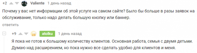О том, что автор не хочет пока сильно масштабироваться, говорит и тот факт, что он даже не разместил на сайте (!) рекламу своих услуг: