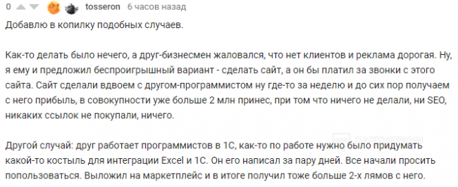 Пост с данной историей был опубликован на Пикабу, в разделе «Бизнес» и за сутки он собрал 400к просмотров и более 800 комментариев. Большинство комментаторов удивляется, почему автор спалил тему и не боится конкуренции, на что тот отвечает, что работы пока непочатый край и что у него есть основная работа: