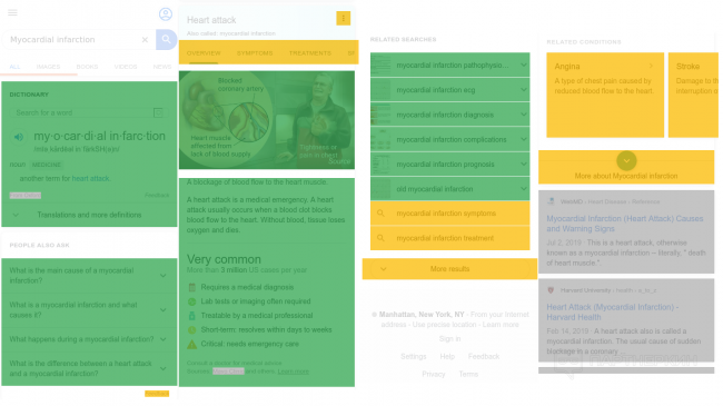 Исследователи The Markup в качестве примера привели поисковой запрос «инфаркт миокарда» («myocardial infarction»), в котором первые 4 результата на странице были заняты продуктами Google: