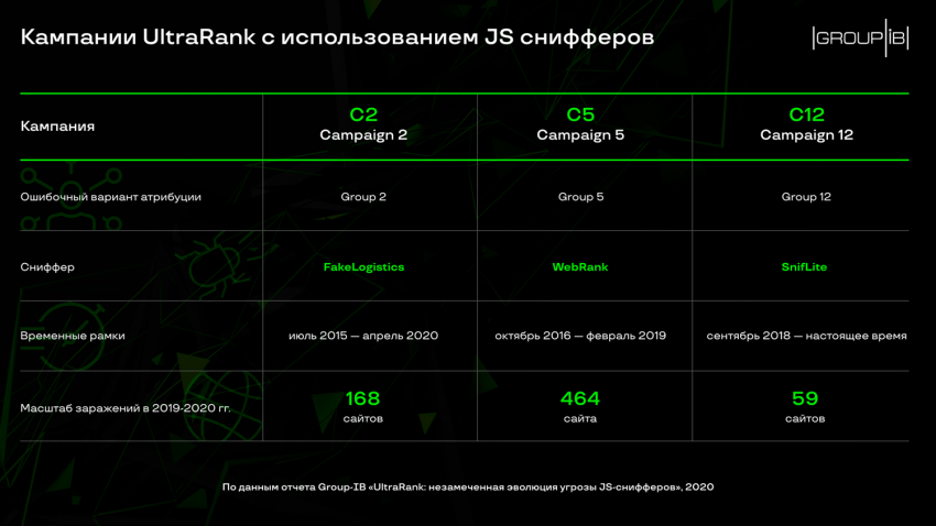 Group-IB обнаружила хак-группу, занимающуюся хищением данных банковских карт и активную около пяти лет. Используя jаvascript-снифферы, группировка атаковала около 700 онлайн-магазинов в Европе, Азии, Северной и Латинской Америке. Украденные данные пользователей хакеры продавали в собственном кардшопе, зарабатывая на этом до 500 000 рублей в день.