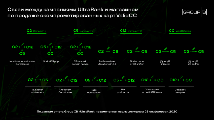 За прошедшие пять лет UltraRank неоднократно меняла инфраструктуру и модифицировала вредоносный код в своем арсенале, в результате чего специалисты других компаний долгое время ошибочно атрибутировали ее атаки разным злоумышленникам. Свои позиции UltraRank укрепляла за счет активной борьбы с конкурентами. Она взламывала уже скомпрометированные сайты и к уже внедренному коду конкурирующей преступной группы добавляла свой JS-сниффер: таким образом украденные данные банковских карт «отправлялись» сразу двум хакерским группам.