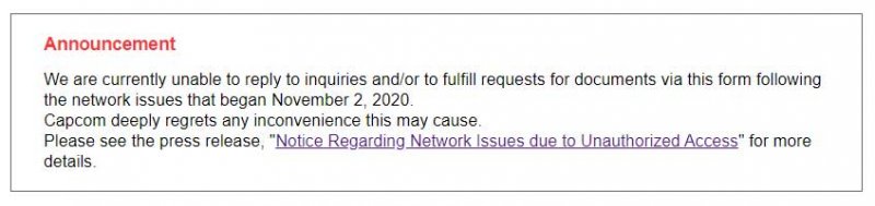 В более детальном пресс-релизе сообщается, что атака неизвестных злоумышленников произошла утром 2 ноября 2020 года и затронула некоторые сети Capcom Group, из-за чего в работе ряда систем возникли проблемы. Так, сбои произошли с уже упомянутой электронной почтой и доступом к файловым серверам, но не повлияли на доступность онлайн-игр и сайтов компании. Судя по всему, части корпоративной сети были отключены самими сотрудниками Capcom, чтобы предотвратить дальнейшее распространение неназванной угрозы.
