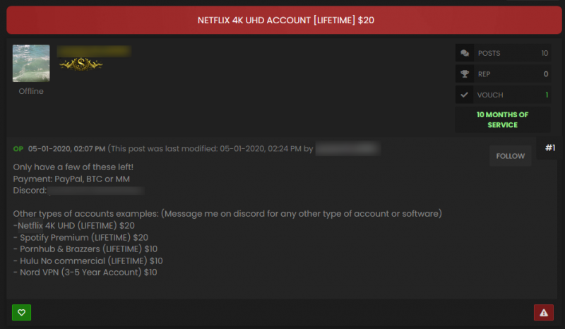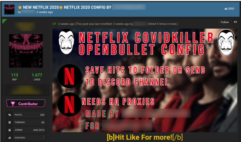 Дело в том, что, по данным Recorded Future, в настоящее время в сети активны не менее 334 злоумышленников, продающих доступ к взломанным учетным записям Netflix или инструменты взлома таких аккаунтов. Цены варьируются от 5 до 20 долларов, а цена файла конфигурации для брутфорса учетных записей Netflix составляет от 20 до 50 долларов.