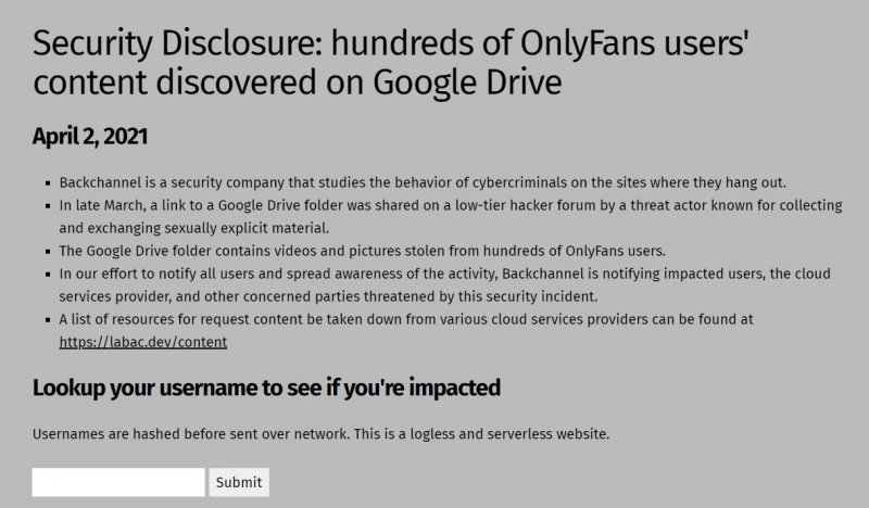 Эксперты ИБ-фирмы BackChannel заметили, что на RaidForums распространяется ссылка на Google Drive, заполненный контентом для взрослых с платформы OnlyFans.