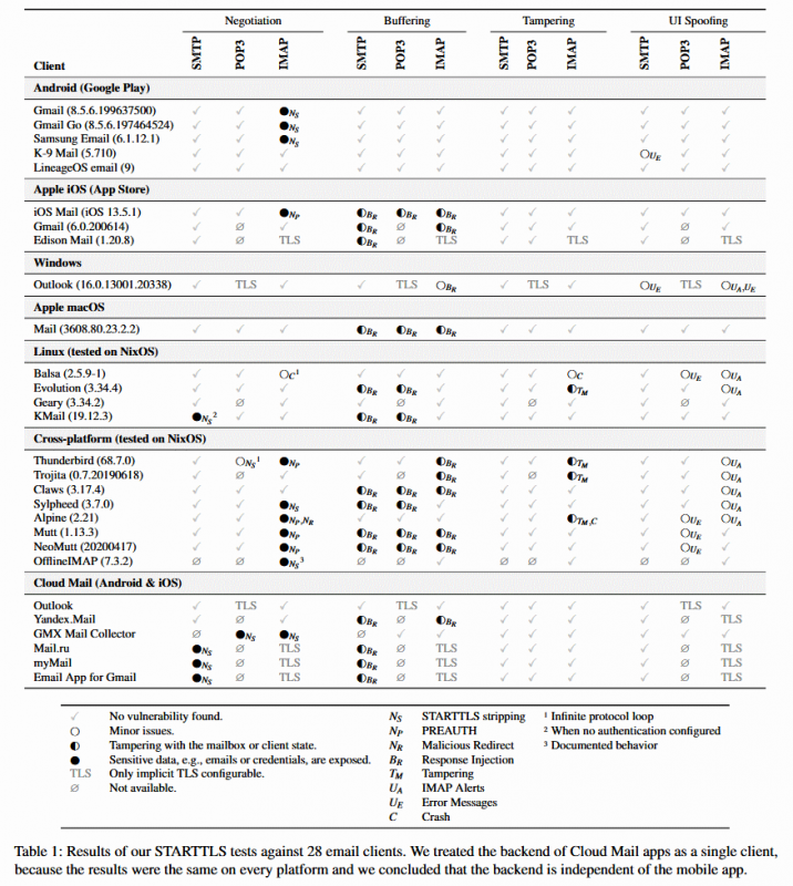 Теперь эксперты сообщают, что обнаружили более 40 уязвимостей в клиентских и серверных имплементациях STARTTLS. Проблемами можно злоупотреблять для даунгрейда соединений STARTTLS до уровня простого текста, перехвата email-сообщений, кражи паролей и так далее.
