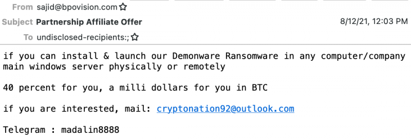 Аналитики компании Abnormal Security обнаружили хакера, который пытался найти инсайдеров в крупных компаниях и предлагал им миллион долларов в биткоинах (40% от предполагаемого выкупа в 2,5 млн долларов), если они помогут развернуть шифровальщика Black Kingdom (он же Demonware) в своей корпоративной сети.