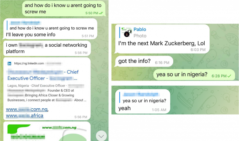 В ходе беседы мошенник подтвердил это предположение, рассказав, что сейчас он пытается создать африканскую социальную сеть и ему нужны деньги. Он шутил, что может стать «следующим Марком Цукербергом». В итоге хакер даже предоставил собеседнику ссылку на свой профиль в LinkedIn, содержащий полное имя. Похоже, он быстро понял, что совершил ошибку и удалил эти сообщения из разговора, однако исследователи успели сделать скриншоты.