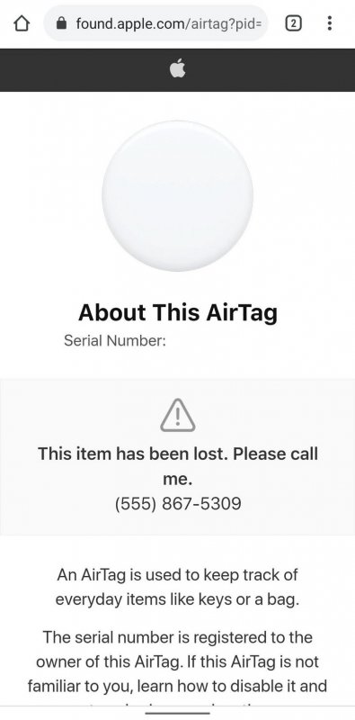 Корень уязвимости заключается в том, что когда пользователь AirTag включают «режим утери», то есть не может найти свою вещь, он может добавить свой номер телефона и настраиваемое сообщение, которое будет отображаться для любого, кто найдет и отсканирует AirTag с помощью любого устройства с поддержкой NFC.