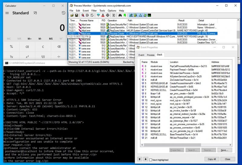 «Я не сделал ничего умного, просто воспроизвел публично доступный PoC-эксплоит в Windows и обнаружил, что запускается calc.exe, — рассказал журналистам Дорманн. — Конечно, Apache должен быть уязвимой версии 2.4.49, mod-cgi должен быть включен, а также должно быть отключено Require all denied. Но если все условия выполнены, тогда CVE-2021-41773 будет работать как RCE».