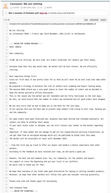 Как объяснили администраторы ресурса в сообщении, подписанном PGP-ключом площадки, они официально уходят на покой и это не exit scam. Послание было опубликовано на прошлой неделе, 23 ноября 2021 года, и сейчас Cannazon уже прекратил работу.