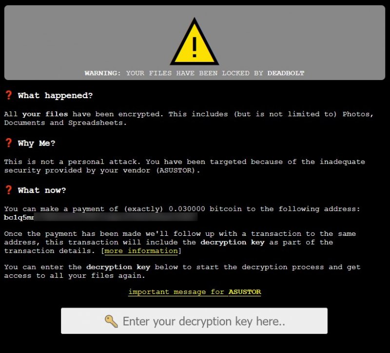 Шифровальщик DeadBolt, недавно атаковавший устройства Qnap NAS, теперь нацелился на ASUSTOR NAS, шифруя файлы и требуя у жертв выкуп в размере 0,03 биткоинов.