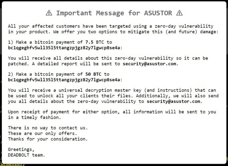 Интересно, что в записке с требованием выкупа хакеры оставили отдельное сообщение для разработчиков, озаглавленное «Важное сообщение для ASUSTOR». Авторы малвари DeadBolt пишут, что готовы раскрыть полную информацию об используемой ими уязвимости нулевого дня, если компания заплатит им 7,5 биткоинов (примерно 290 000 долларов США). Также они сообщали, что готовы продать мастер-ключ, который поможет расшифровать файлы всех жертв, и информацию о 0-day за 50 биткоинов, то есть почти за 1,9 миллиона долларов США. Напомню, что такие же требования злоумышленники пытались выдвинуть и компании Qnap.