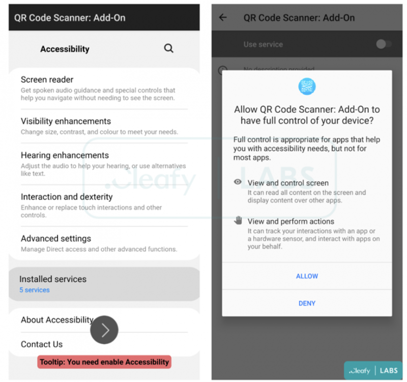Как только такое «обновление» завершается, TeaBot загружается на устройство жертвы как новое приложение QR Code Scanner: Add-On. Это приложение запускается автоматически и запрашивает права на использование Accessibility Services для выполнения работы следующих функций: