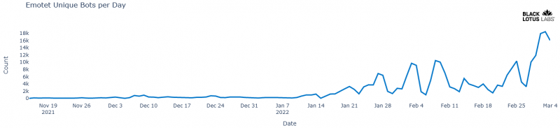 Аналитики из Black Lotus Lab решили более подробно изучить новый виток развития Emotet. Как можно видеть на графике ниже, ботнет начал медленно воссоздавать себя в ноябре прошлого года, а с января 2022 года стал расти гораздо быстрее благодаря фишинговым кампаниям.