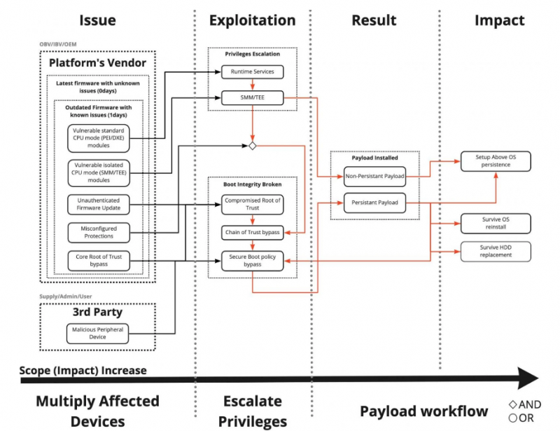 Проблемы затрагивают широкий спектр корпоративных продуктов HP, включая десктопы, ноутбуки, PoS и так далее. Поскольку DXE и SSM активируются до запуска операционной системы, любые баги в этих компонентах, превышающих привилегии ОС ядра, помогают обойти практически любые средства защиты.
