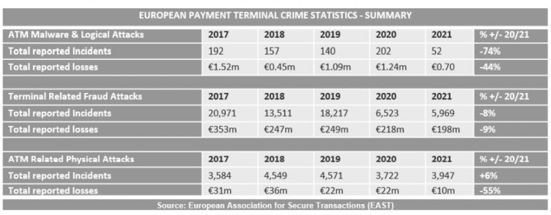 Интересно, что количество физических атак на банкоматы, наряду с применением скиммеров и малвари, в целом остается весьма высоким. К примеру, по данным Европейской группы по обеспечению безопасности банкоматов (European ATM Security Team, EAST), в 2021 году количество таких атак возросло на 6% — до 3947 инцидентов, по сравнению с 3722 инцидентами в 2020 году.