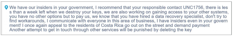 Тайной целью атаки на Коста-Рику, которую провозгласило внутреннее руководство Conti, была публичность, а не получение выкупа. Внутренняя переписка между членами группы показывает, что запрошенный выкуп был намного меньше миллиона долларов США (несмотря на слухи о том, что группировка запрашивала выкуп в размере 10 млн долларов США, и собственные заявления Conti о том, что сумма выкупа составляла 20 млн долларов США)», — рассказываю специалисты Advanced Intel.