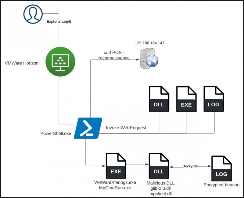 Первоначальной точкой компрометация, в обоих изученных аналитиками Sentinel Labs случаях, стала эксплуатация уязвимости Log4j на уязвимых серверах VMWare Horizon, что приводило к запуску кода PowerShell. Получив доступ к целевой системе и необходимые привилегии, злоумышленники используют PowerShell для загрузки трех файлов: чистой копии утилиты Windows CL, файла DLL и файла LOG.