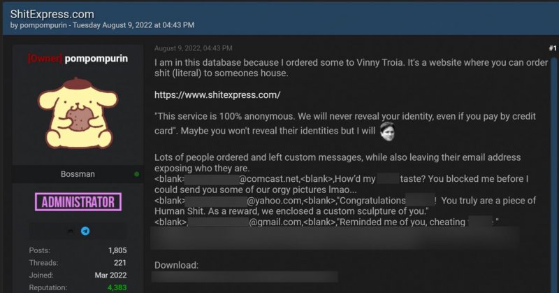 На этот раз, посетив ShitExpress, pompompurin обнаружил, что сайт уязвим перед SQL-инъекциями. В итоге хакер взломал ресурс и смог получить доступ ко всем сообщениям клиентов, email-адресам и другим личным данным, связанным с заказами. Теперь он публикует некоторые особенно забавные послания клиентов ShitExpress на своем форуме и выложил там же украденную БД.