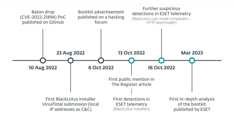 Впервые BlackLotus был замечен в октябре 2022 года. Его продавец утверждал, что буткит имеет встроенный обход Secure Boot, встроенную защиту от удаления на уровне Ring0/Ядра, а также запускается в режиме восстановления и в безопасном режиме.