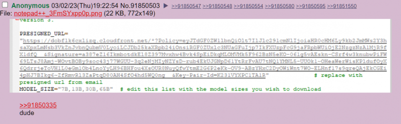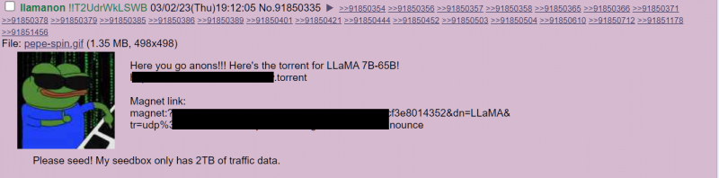 На прошлой неделе пользователь 4chan llamanon «слил» в открытый доступ языковую модель LLaMA (Large Language Model Meta AI), к которой ранее получили доступ избранные исследователи и ученые. Пока руководство Meta** не предприняло никаких действий для удаления этого торрент-файла, который по-прежнему доступен для скачивания.