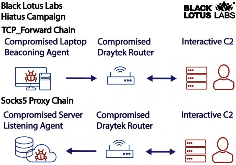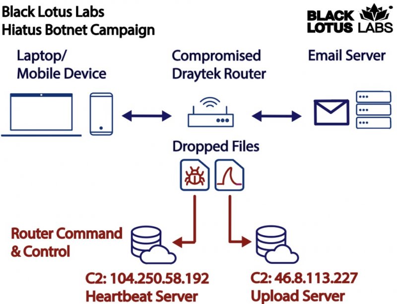 ИБ-специалисты обнаружили вредоносную кампанию Hiatus, в рамках которой злоумышленники заразили около 100 устаревших маршрутизаторов DrayTek Vigor 2960 и 3900 (около 2% маршрутизаторов этих моделей, подключенных к интернету) с целью кражи данных их владельцев и создания скрытой прокси-сети. Эксперты предупреждают, что в рамках этой кампании, распространившейся на Северную и Южную Америку, а также Европу, хакеры могут перехватывать электронную почту жертв и похищать файлы.