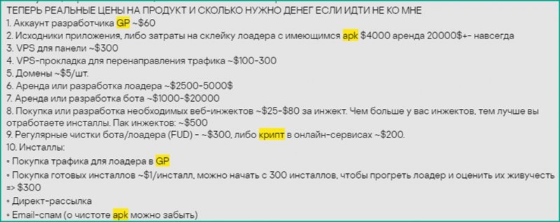 При этом точная стоимость услуг оговаривается в каждом конкретном случае на форумах или в Telegram, что позволяет преступникам кастомизировать приложения, оснащая из собственными вредоносными функциями.