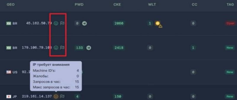 Кроме того, теперь оператор малвари может видеть оценку профиля активности каждого IP-адреса прямо из панели управления, где зеленые, желтые и красные смайлики указывают на вероятность активности бота.