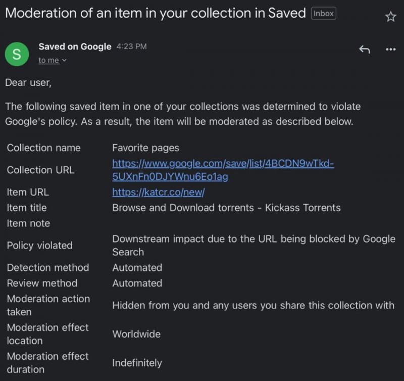 Издание TorrentFreak обратило внимание на сообщение пользователя Эдди Рузенмааллена (Eddie Roosenmaallen), который поделился полученным от Google письмом. В этом послании компания уведомляет, что одна из ссылок в его коллекции Google Saved (ведущая на уже недействующий домен KickassTorrents) удалена, поскольку нарушала политики Google.