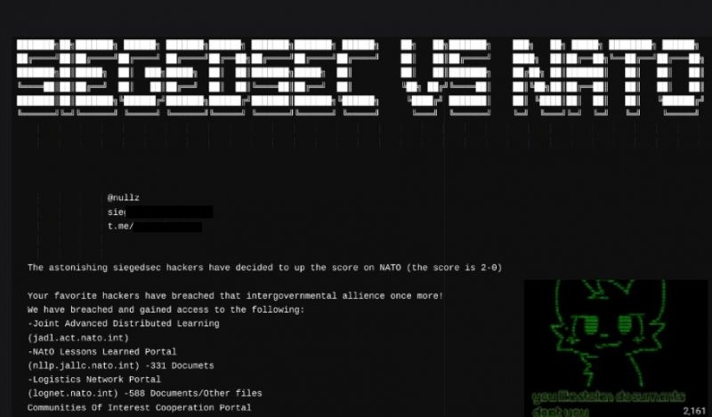 Хакеры из группы SiegedSec заявили, что им вновь удалось скомпрометировать некоторые сайты альянса НАТО. На этот раз злоумышленники говорят, что похитили более 3000 файлов и 9 ГБ данных.