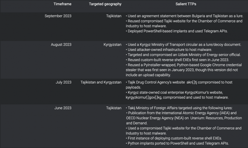 По данным Cisco Talos, жертвами атак этой группы уже стали Торговая палата, Агентство по контролю за оборотом наркотиков и Министерство иностранных дел Таджикистана, компания «Кыргызкомур» из Кыргызстана, а также чиновник из Министерства энергетики Узбекистана.