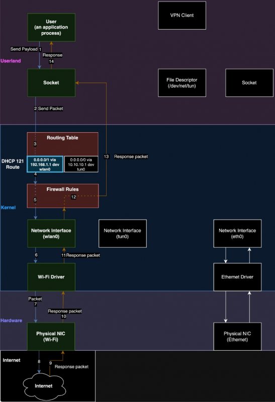 Атака TunnelVision позволяет направлять трафик за пределы VPN-туннеля, что дает злоумышленникам возможность прослушивать незашифрованный трафик, при этом сохраняя видимость защищенного VPN-соединения.