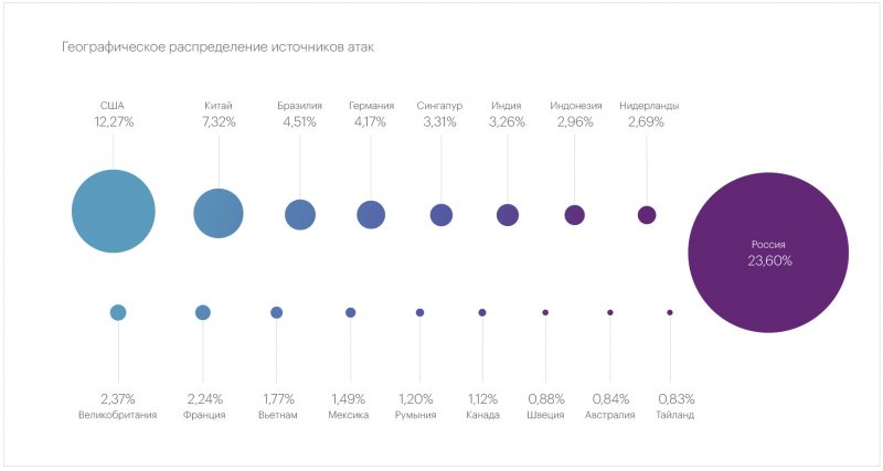 Тройка лидеров стран-источников вредоносного трафика остается неизменной уже несколько кварталов подряд. Россия, как и прежде, возглавила топ-20: в первом квартале здесь было заблокировано 23,6% IP-адресов (однако это почти в два раза меньше показателя четвертого квартала 2023 года, который составил 42,03% от общего числа). На втором и третьем местах оказались США и Китай – 12,27% и 7,32% блокировок.