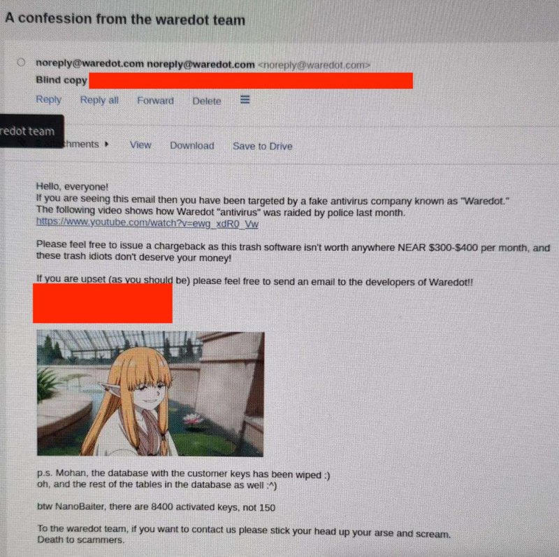 Один из подобных взломов недавно оказался направлен на компанию Waredot, которая якобы предлагает пользователям антивирусные решения. На сайте Waredot сказано, что компания «дает людям возможность безопасно жить цифровой жизнью». Однако хакер под ником NanoBaiter утверждает, что Waredot — мошенники.