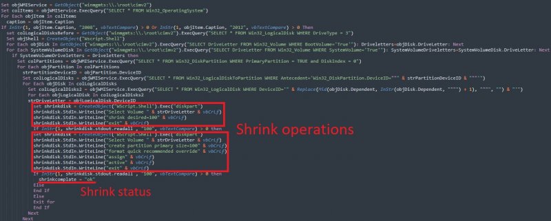 Так, малварь выполняет операции по изменению размеров диска, которые варьируются в зависимости от версии ОС. К примеру, чтобы изменить размер локальных дисков в Windows Server 2008 и 2012, скрипт проверяет основной загрузочный раздел и сохраняет эту информацию. Также он сохраняет индекс других разделов, а затем выполняет следующие действия с помощью diskpart: