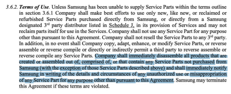 «Компания должна немедленно разобрать любые устройства, которые созданы, собраны из, состоят из или содержат любые сервисные детали, приобретенные не у Samsung, — говорится в одном из разделов документа. — Компания обязана немедленно уведомить Samsung в письменной форме о деталях и обстоятельствах любого несанкционированного использования или незаконного присвоения любой сервисной детали для любых целей, кроме как в соответствии с настоящим соглашением. Samsung может расторгнуть настоящее соглашение в случае нарушения этих условий».